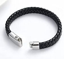 Design: Woven black leather strap bracelet with silver coloured steel rectangle block end clasps which acts as the fill chamber with a locking screw on the bottom edge.