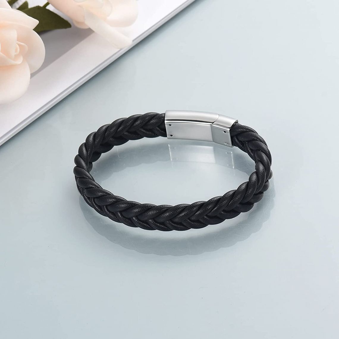 This Bracelet is made from Black leather with a High quality hypoallergic 316L Stainless steel claps, beautifully crafted from high grade materials.